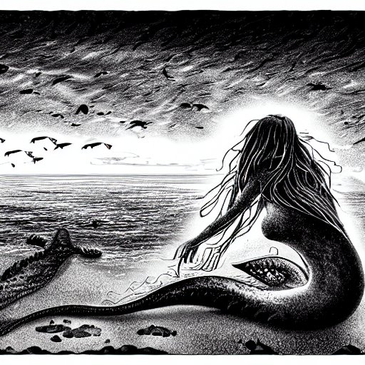 Méadhbh ließ sich neben dem Kleidungsstück auf die Felsen nieder und begann rasch auf der Bodhrán zu spielen. Sie entschied sich für eine Melodie, die sie normalerweise immer für ihren Sohn spielte. Es dauerte nicht lange, bis sich grüne Algen aus dem Wasser erhoben. Nein, keine Algen, sondern der Körper einer Meerjungfrau. Ihre Haut war von Schuppen überzogen, ihre Haare leuchteten giftgrün unter ihrer Haube, ihrer cochallin draíochta [kɒkɑlɪn dɹi:ktə]. Sie zog ihren Körper mit dem Geräusch schleimiger Pfropfen über die Felsen auf Méadhbh zu, die höllenroten Augen auf die Bodhrán gerichtet. Keine Lider, die hätten blinzeln können. Ein starker Gestank nach Fisch ging von der Meerjungfrau aus. Die cochallin draíochta pochte, während die fleischigen Tentakel der Haube, die zwischen den Kiemen am Hals der Meerjungfrau steckten, ihre Härchen aufrichteten.