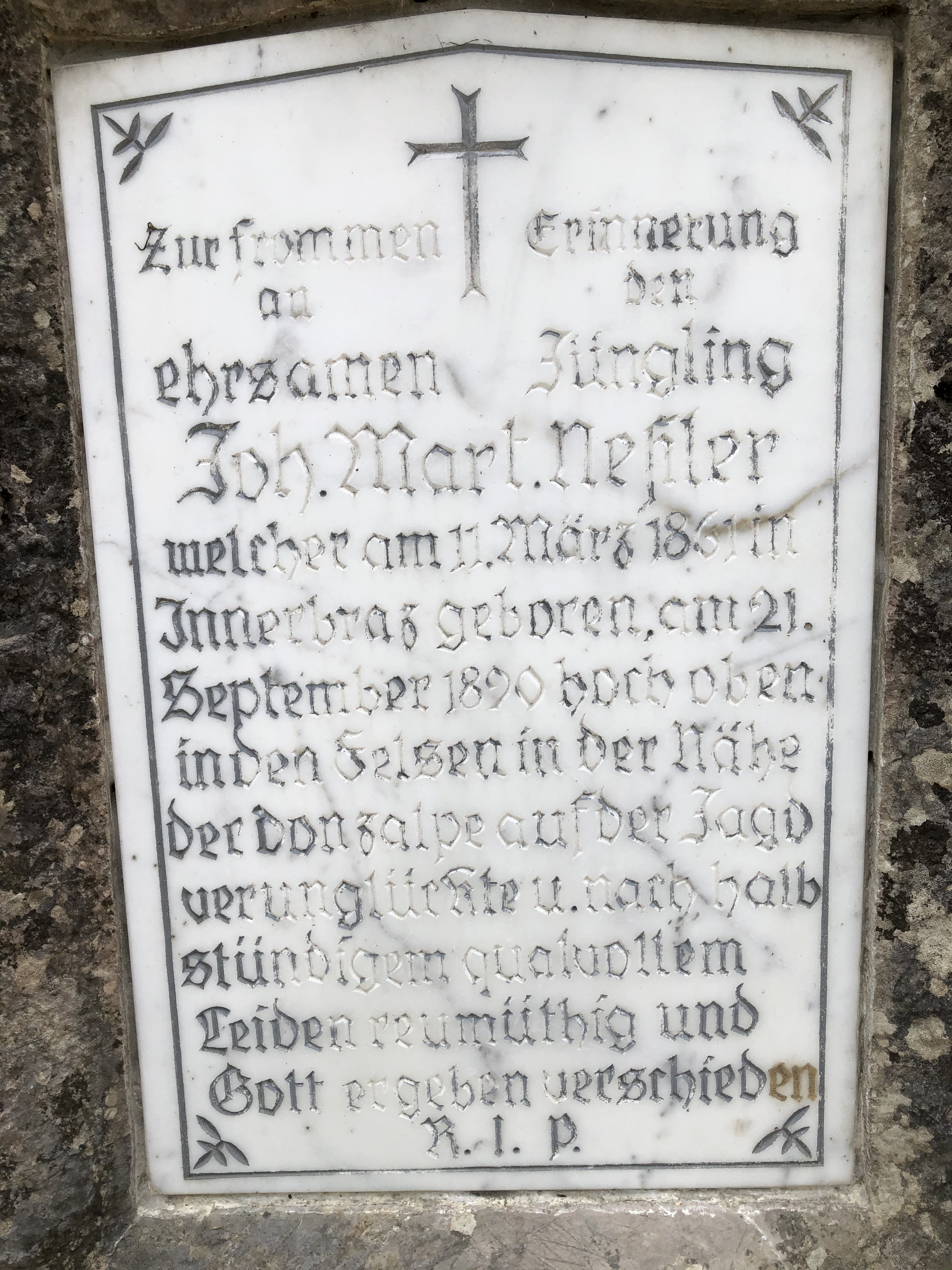 Die Woche zuvor hatte ich Carrara Marmor aus Italien erhalten, der Monate auf sich warten hatte lassen. Nach kurzem Bedenken entschied ich mich, ihn dafür zu gebrauchen. Ich schnitt den Stein zu und bettete ihn in einen passenden Kalkstein. Die Inschrift gravierte ich auf Wunsch der Mutter. Sie verstarb wenige Tage nach Fertigstellung der Gedenktafel, zuversichtlich, ihren Sohn im Jenseits wieder zu sehen.