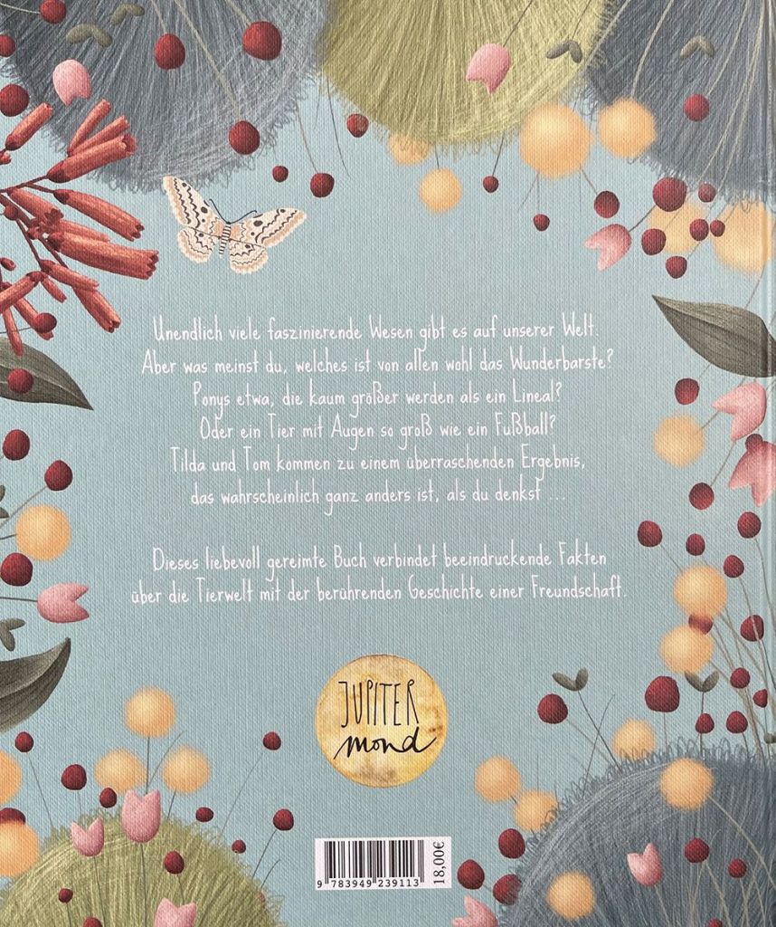 Unendlich viele faszinierende Wesen gibt es auf unserer Welt. Aber was meinst du, welches ist von allen wohl das Wunderbarste? Ponys etwa, die kaum größer werden als ein Lineal? Oder ein Tier mit Augen so groß wie ein Fußball? Tilda und Tom kommen zu einem überraschenden Ergebnis, das wahrscheinlich ganz anders ist, als du denkst… Dieses liebevoll gereimte Buch verbindet beeindruckende Fakten über die Tierwelt mit der berührenden Geschichte einer Freundschaft.